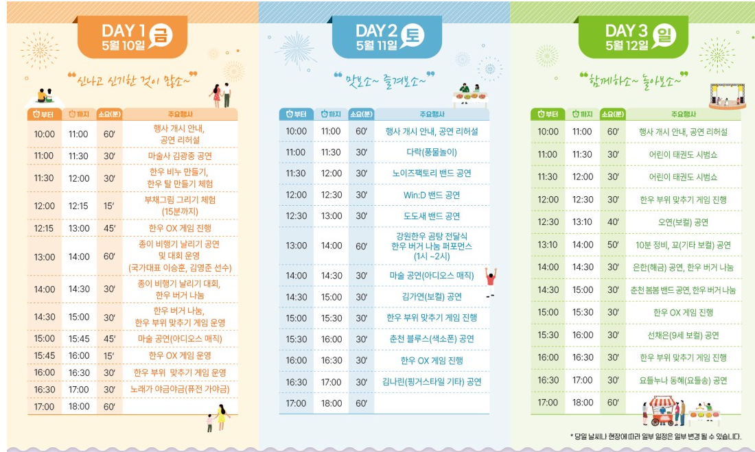 - 체험 프로그램: 부채 그림 그리기, 풍선 아트, 한우 클레이탈 만들기, 페이스 페인팅, 비누만들기 체험, 샌드 아트 체험 등