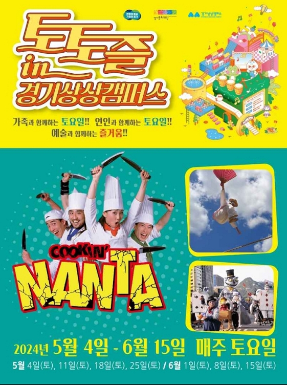 경기도 수원시 숲속놀이터 경기상상캠퍼스에서 토요일마다 다채로운 문화예술 프로그램이 펼쳐집니다. 난타, 퍼레이드 등의 공연 관람도 가능하고 가족과 함께 참여할 수 있는 랜덤플레디 댄스, 상상놀이터, 체험 마켓도 준비되어 있습니다.